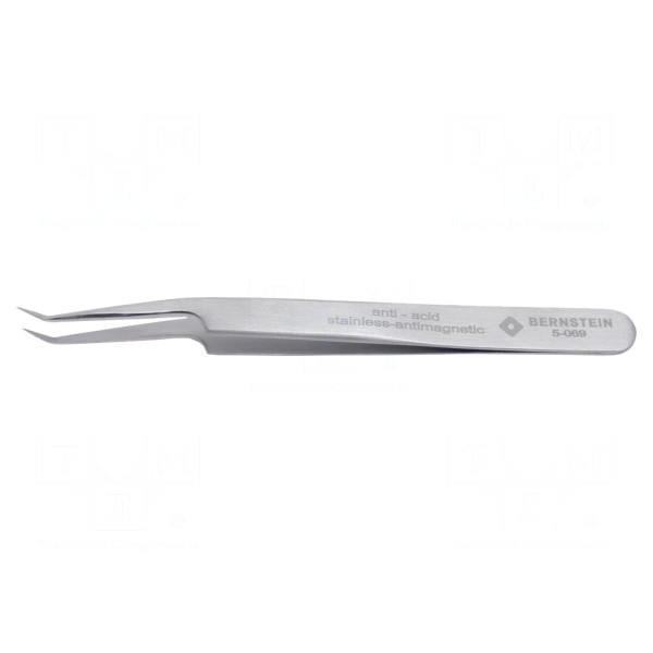 Pęseta BERNSTEIN to zagięte narzędzie ręczne o długości 115mm, przeznaczone do prac uniwersalnych. Konstrukcja wykonana ze stali nierdzewnej zapewnia odporność materiałową podczas manipulacji małymi elementami.