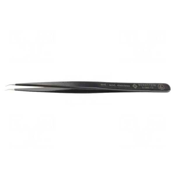 Pęseta BERNSTEIN o długości 140 mm została wykonana ze stali nierdzewnej w wersji ESD, co pozwala na bezpieczną pracę z elementami wrażliwymi na wyładowania elektrostatyczne. Narzędzie posiada prostą konstrukcję oraz ostre, zagięte końcówki, które umożliwiają precyzyjny chwyt drobnych elementów.