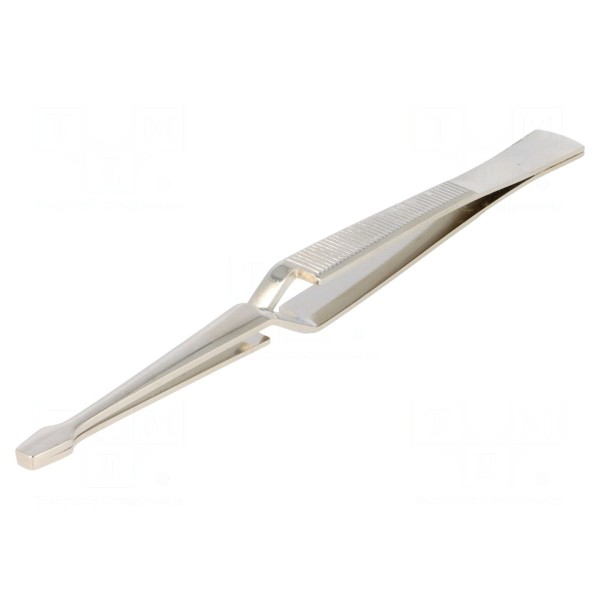 Narzędzie charakteryzuje się długością wynoszącą 160mm oraz końcówką w kształcie łopatki o szerokości 5mm. Powierzchnie chwytające zostały wyposażone w poprzeczne rowkowania, co wpływa na stabilność chwytu. Masa netto pęsety wynosi 25g.