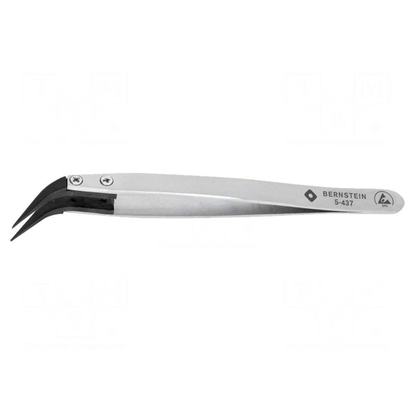 Pęseta BERNSTEIN 5-437 to narzędzie w wykonaniu ESD, zaprojektowane do prac precyzyjnych wymagających ochrony przed wyładowaniami elektrostatycznymi. Model ten charakteryzuje się zagiętym kształtem ostrzy z ostrym wykończeniem końcówek, co umożliwia precyzyjny chwyt drobnych elementów.