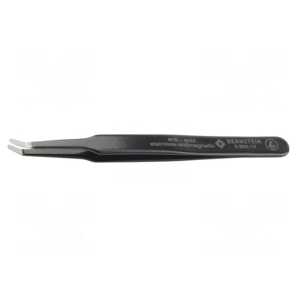 Pęseta BERNSTEIN 5-862-13 to narzędzie wykonane ze stali nierdzewnej, zaprojektowane w wersji ESD, co pozwala na bezpieczną pracę z elementami wrażliwymi na wyładowania elektrostatyczne. Konstrukcja narzędzia charakteryzuje się zagiętym kształtem ostrzy.