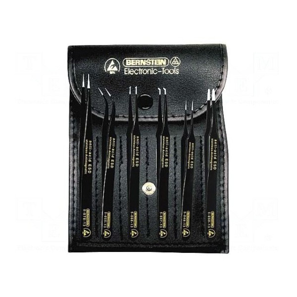 W zestawie: pęseta prosta ostro zakończona o długości 110 mm, pęseta prosta o szerokości ostrza 1,6 mm i długości 120 mm, pęseta prosta o szerokości ostrza 1 mm i długości 130 mm, pęseta prosta zaokrąglona o szerokości ostrza 2 mm i długości 120 mm, pęseta zagięta pod kątem 45° o szerokości ostrza 2 mm i długości 120 mm oraz pęseta zagięta ostro zakończona o długości 120 mm. Całość dostarczana jest w etui, które ułatwia przechowywanie oraz zabezpiecza końcówki narzędzi przed uszkodzeniem.