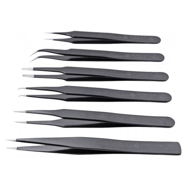 Zestaw składa się z sześciu pęset wykonanych ze stali nierdzewnej. Narzędzia posiadają konstrukcję ESD, co umożliwia ich użycie w miejscach wymagających ochrony przed wyładowaniami elektrostatycznymi.