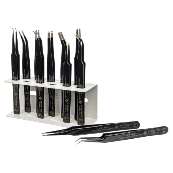 Zestaw zawiera 11 pęset wykonanych ze stali nierdzewnej, zaprojektowanych do wykonywania prac precyzyjnych. Narzędzia posiadają właściwości ESD, co pozwala na bezpieczne użycie podczas manipulacji elementami wrażliwymi na wyładowania elektrostatyczne.