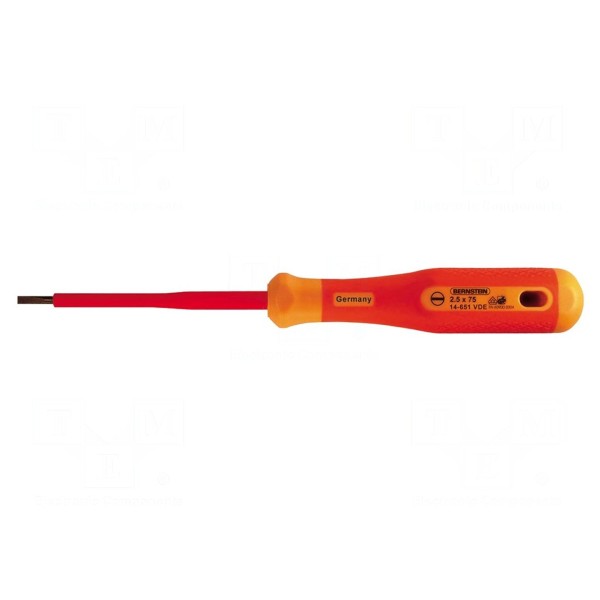 Wkrętak izolowany BERNSTEIN 14-651-VDE został wyposażony w płaski grot o rozmiarze SL 2,5. Długość ostrza wynosi 75 mm, natomiast całkowita długość narzędzia to 175 mm.