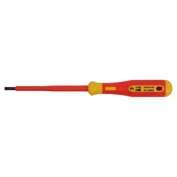 Wkrętak izolowany BERNSTEIN 14-653-VDE to narzędzie z grotem płaskim w rozmiarze SL 4. Długość ostrza wynosi 100 mm, natomiast całkowita długość wkrętaka to 200 mm.