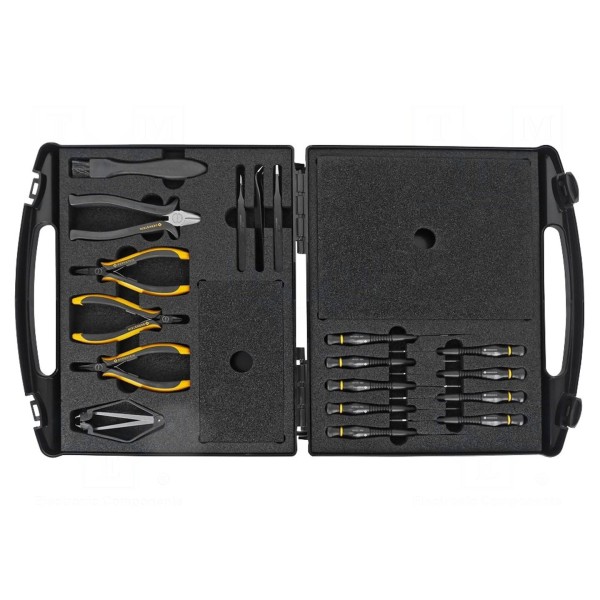 Zestaw narzędzi ogólnego stosowania zawiera 18 elementów przeznaczonych do prac wymagających zabezpieczeń przed wyładowaniami elektrostatycznymi. Wersja ESD zapewnia parametry niezbędne do pracy z wrażliwymi podzespołami elektronicznymi.