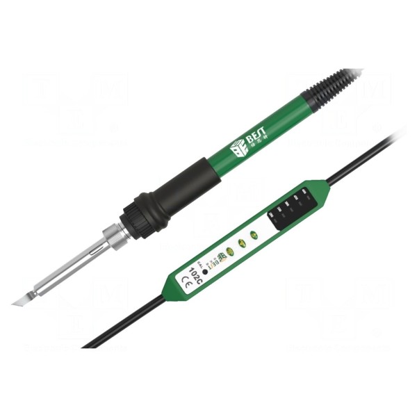 Lutownica grzałkowa BEST BST-102C to urządzenie przeznaczone do prac lutowniczych, zasilane napięciem 230V. Konstrukcja wykorzystuje ceramiczną grzałkę o mocy 60/90W, co umożliwia uzyskanie temperatury pracy w zakresie od 280°C do 480°C. Urządzenie zostało wyposażone w cyfrowy system regulacji temperatury, obsługiwany za pomocą przycisków umieszczonych na obudowie.