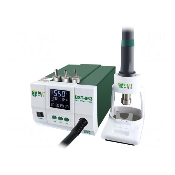 Stacja gorącego powietrza BST-863 o mocy 1200W przeznaczona jest do pracy z układami BGA, CHIP, PLCC, QFP, SMD oraz SOIC, a także do procesów obkurczania. Urządzenie oferuje cyfrowy zakres regulacji temperatury w przedziale 100–550°C z dokładnością ±1°C oraz kontrolę przepływu powietrza od 0 do 180 l/min. Obsługa stacji odbywa się poprzez intuicyjny panel dotykowy, a bieżące parametry pracy prezentowane są na wyświetlaczu LCD. Konstrukcja typu ESD zapewnia bezpieczeństwo pracy z elementami wrażliwymi na ładunki elektrostatyczne.