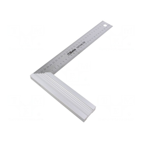Kątownik stolarski Beta 1674A/300 to przyrząd pomiarowy o wymiarach 300x169mm. Konstrukcja narzędzia pozwala na precyzyjne trasowanie oraz sprawdzanie kątów w pracach stolarskich.