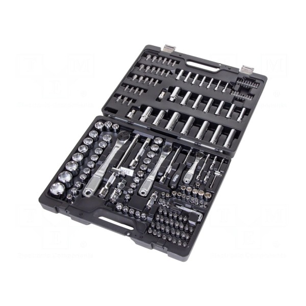 Zestaw zawiera 170 elementów, w tym klucze 6-kątne nasadowe oraz końcówki wkrętakowe. Narzędzia przeznaczone są do obsługi połączeń śrubowych z wykorzystaniem gniazd o rozmiarach 1/2", 1/4" oraz 3/8".