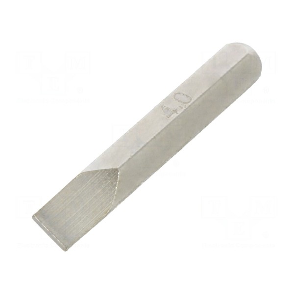 Końcówka wkrętakowa płaska o wymiarach grotu 4x0,8 mm stanowi element narzędziowy typu precyzyjnego. Komponent posiada sześciokątny rodzaj uchwytu, który jest kompatybilny z gniazdami o rozmiarze 4 mm.