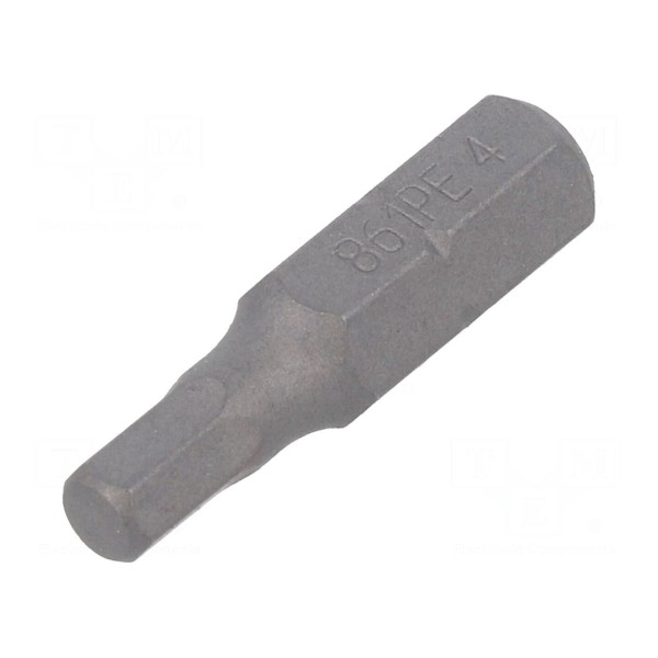 Końcówka wkrętakowa typu imbus przeznaczona jest do pracy z wkrętami o gnieździe HEX 4mm. Element posiada całkowitą długość wynoszącą 25mm.