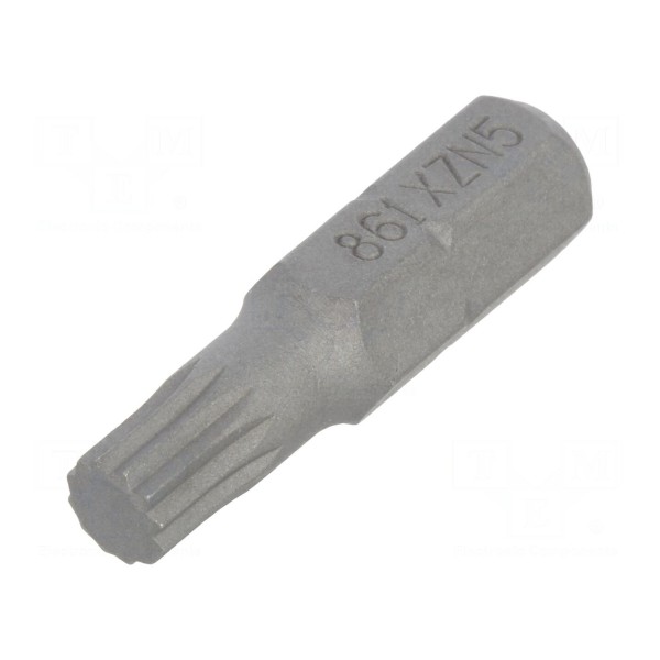 Końcówka wkrętakowa o profilu spline 12-kątnym przeznaczona do prac montażowych z gniazdami typu XZN M5. Element posiada standardowy uchwyt o rozmiarze 1/4" typu C6,3mm, co zapewnia kompatybilność z szeroką gamą narzędzi ręcznych oraz elektronarzędzi.