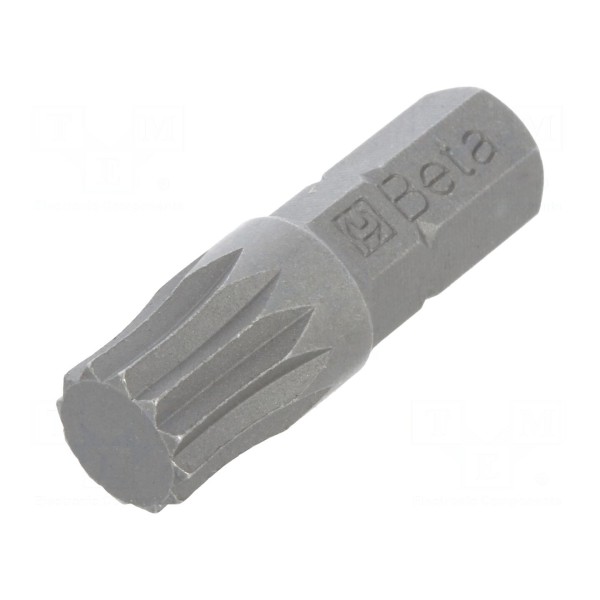 Końcówka wkrętakowa Beta typu spline (12-kątne) charakteryzuje się rozmiarem grota XZN M8. Element jest przystosowany do pracy z gniazdem uchwytu o wymiarze 1/4" oraz standardzie uchwytu C6,3mm. Całkowita długość narzędzia wynosi 25mm. Produkt przeznaczony jest do współpracy z odpowiednimi adapterami lub wkrętakami posiadającymi gniazdo sześciokątne 1/4".