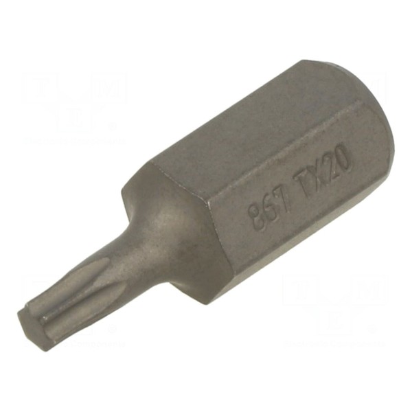 Końcówka wkrętakowa przeznaczona do współpracy z wkrętami typu Torx o rozmiarze TX20. Element wyposażony jest w uchwyt o rozmiarze 1/4", odpowiadający standardowi C6,3mm.