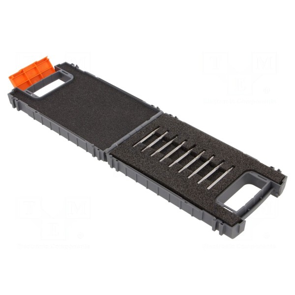 Zestaw pilników obrotowych przeznaczony do obróbki metalu, wykonany z węglika spiekanego. Komplet składa się z 9 elementów o zróżnicowanej geometrii, w tym wersji cylindrycznych, stożkowych oraz pilników typu tarnik i zgrubnych.