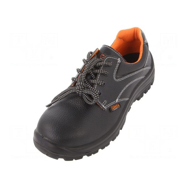 Półbuty ochronne wykonane ze skóry w kolorze czarnym, przeznaczone do użytkowania w budownictwie, logistyce, przemyśle lekkim i rolniczym oraz usługach. Obuwie wyposażone jest w podnosek metalowy, który chroni palce przed urazami mechanicznymi. Produkt jest zgodny z normami CE oraz EN ISO 20345:2011.