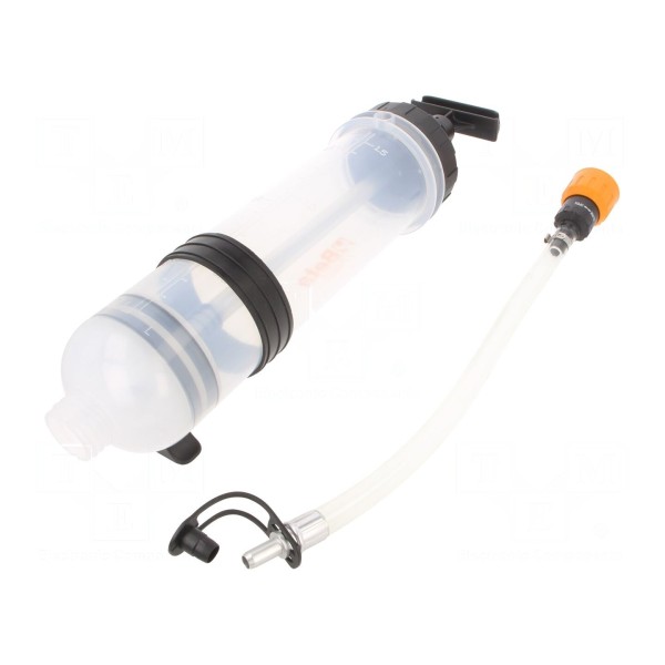 Narzędzie przeznaczone do obsługi płynów eksploatacyjnych, w szczególności olejów. Urządzenie wyposażone jest w zbiornik o pojemności 1,5l, co pozwala na sprawne dozowanie lub odsysanie medium w warunkach warsztatowych.