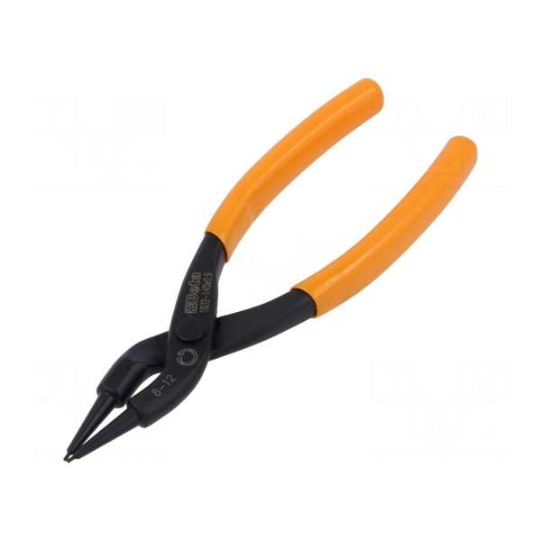 Szczypce proste przeznaczone do obsługi wewnętrznych pierścieni osadczych o średnicy od 8 do 12 mm. Narzędzie charakteryzuje się konstrukcją dostosowaną do precyzyjnego montażu oraz demontażu zabezpieczeń wewnątrz otworów.