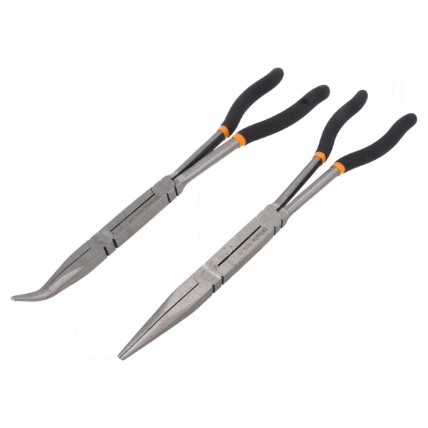 Zestaw zawiera dwie sztuki szczypiec o konstrukcji półokrągłej wydłużonej. Narzędzia przeznaczone są do prac wymagających precyzyjnego chwytania elementów w miejscach o ograniczonej dostępności.