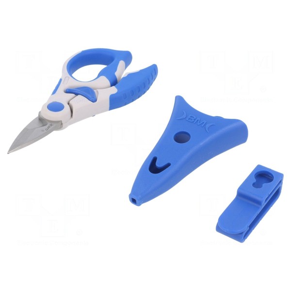 Nożyczki BM1325 to narzędzie przeznaczone do prac z kablami, charakteryzujące się długością całkowitą 153 mm. Ostrze wykonane zostało ze stali nierdzewnej i posiada ząbkowaną krawędź tnącą, co wpływa na charakterystykę cięcia przewodów. Konstrukcja narzędzia umożliwia również sprawne ściąganie izolacji z przewodów okrągłych.