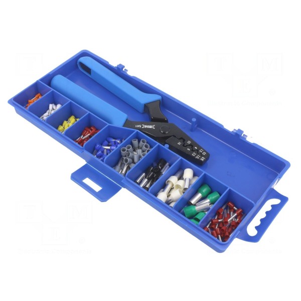 Zestaw narzędzi służy do zaciskania izolowanych końcówek tulejkowych na przewodach o przekroju od 0,5mm² do 16mm². Całość kompletu przechowywana jest w pudełku ułatwiającym organizację i transport akcesoriów. Konstrukcja zestawu umożliwia obsługę końcówek w pełnym zakresie podanych przekrojów przewodów. Wykorzystanie pudełka jako opakowania pozwala na przechowywanie narzędzi w warunkach warsztatowych przy zachowaniu porządku w osprzęcie instalacyjnym.