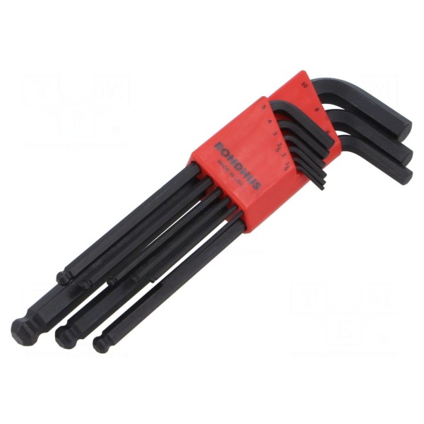 W skład kompletu wchodzą klucze o następujących rozmiarach: 1,5 mm, 2 mm, 2,5 mm, 3 mm, 4 mm, 5 mm, 6 mm, 8 mm oraz 10 mm. Konstrukcja końcówki kulistej umożliwia pracę pod kątem, co pozwala na obsługę śrub w miejscach o ograniczonym dostępie.