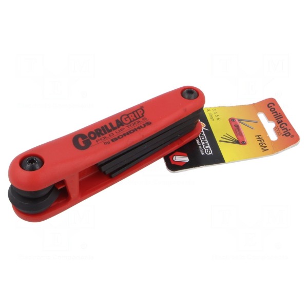 Zestaw zawiera sześć składanych kluczy imbusowych typu HEX. W skład kompletu wchodzą klucze o rozmiarach 3mm, 4mm, 5mm, 6mm, 8mm oraz 10mm.