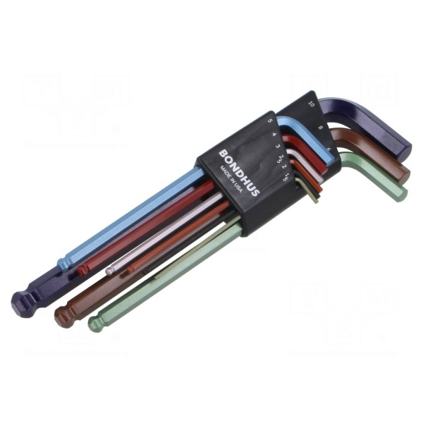 Zestaw zawiera 9 długich kluczy imbusowych o przekroju HEX w rozmiarach 1,5mm, 2mm, 2,5mm, 3mm, 4mm, 5mm, 6mm, 8mm oraz 10mm. Narzędzia wyposażono w końcówkę kulistą, która umożliwia pracę pod kątem względem osi śruby.