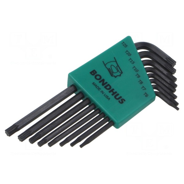 W skład zestawu wchodzą klucze o rozmiarach TX6, TX7, TX8, TX9, TX10, TX15, TX20 oraz TX25. Całość kompletu składa się z 8 sztuk narzędzi.