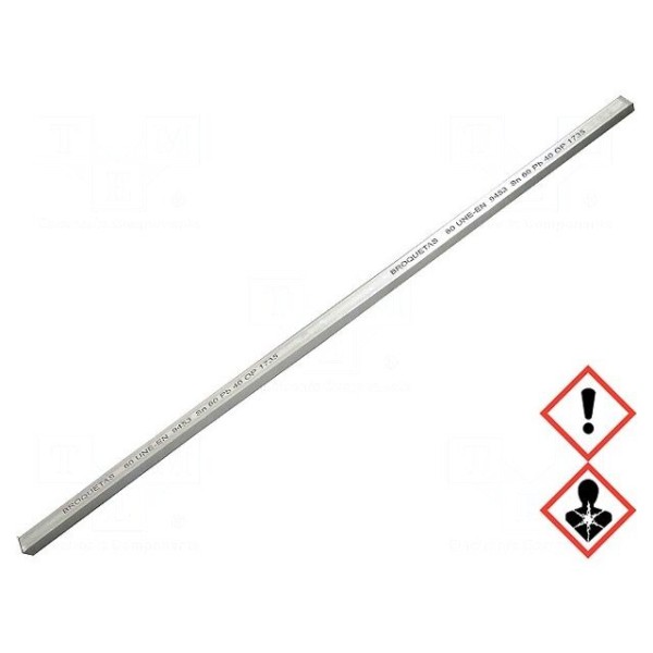 Spoiwo lutownicze w formie laski o wymiarach 9x4 mm przeznaczone do lutowania miękkiego. Stop Sn60Pb40 charakteryzuje się zakresem temperatury topnienia od 183°C do 190°C. Produkt jest zgodny z normą EN ISO 9453 i zawiera topnik SW26 typu No Clean, który jest kalafoniowy oraz halogenkowy, sklasyfikowany jako ROM1.