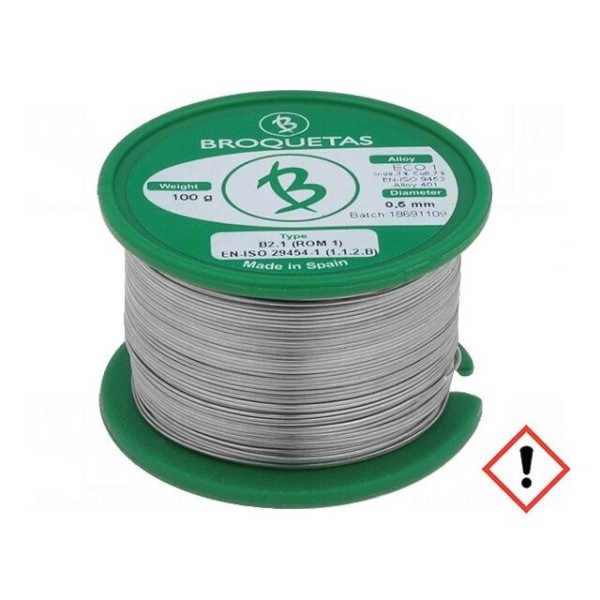 Drut lutowniczy bezołowiowy o składzie stopu Sn99,3Cu0,7 przeznaczony jest do procesów lutowania miękkiego. Średnica przewodu wynosi 0,5 mm, a całość masy spoiwa została umieszczona na szpuli o wadze 0,1 kg.
