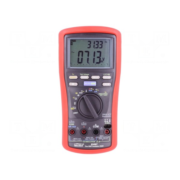 Miernik BRYMEN BM887 to urządzenie przeznaczone do pomiaru rezystancji izolacji przy napięciach testowych 50V, 100V, 250V, 500V oraz 1kV. Zakres pomiarowy rezystancji izolacji obejmuje wartości do 25GΩ. Przyrząd pełni również funkcję multimetru, umożliwiając pomiar napięć AC i DC do 1kV, prądów AC i DC do 10A, rezystancji do 60MΩ, pojemności od 2µF do 20mF, częstotliwości w zakresie 10–100kHz oraz temperatury w przedziale od -40 do 537°C.