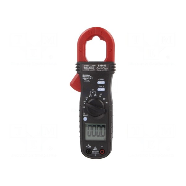 Miernik cęgowy BRYMEN BM035 to cyfrowe urządzenie przeznaczone do pomiaru napięcia AC/DC oraz prądu AC/DC do 600A. Przyrząd obsługuje pomiar rezystancji w zakresach 600Ω i 6kΩ oraz realizuje testy ciągłości obwodu z sygnalizacją akustyczną i optyczną oraz test diody 3V. Urządzenie wyposażono w funkcję True RMS, co umożliwia uzyskanie dokładnych wyników pomiarowych dla przebiegów odkształconych.