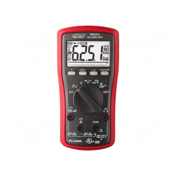 Multimetr cyfrowy BRYMEN BM2251 przeznaczony jest do pomiarów napięcia AC/DC w zakresach do 600V, prądu AC/DC do 10A, rezystancji do 60MΩ oraz częstotliwości w paśmie 10Hz...200kHz. Urządzenie oferuje pomiar rzeczywistej wartości skutecznej True RMS dla prądu przemiennego oraz posiada wbudowaną funkcję AutoCheck, umożliwiającą automatyczną selekcję parametrów LoZ DCV, LoZ ACV oraz rezystancji. Pomiar prezentowany jest na wyświetlaczu LCD z bargrafem o 60 segmentach, odświeżanym z częstotliwością 40x/s, przy podstawowej szybkości próbkowania przetwornika wynoszącej 5x/s.