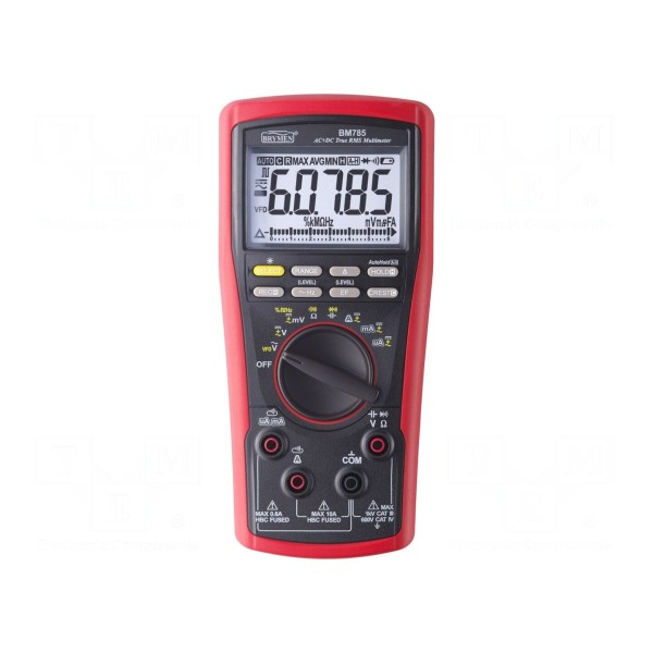 Multimetr cyfrowy BM785 umożliwia wykonywanie pomiarów napięcia AC/DC do 1kV, prądu AC/DC do 10A, rezystancji do 60MΩ oraz pojemności do 10mF. Urządzenie obsługuje pomiar częstotliwości w zakresie od 5Hz do 1MHz oraz pomiar współczynnika wypełnienia. Wyposażony w wyświetlacz LCD o rozdzielczości 60000 cyfr z bargrafem, miernik charakteryzuje się częstotliwością próbkowania na poziomie 5 razy na sekundę oraz funkcją True RMS.