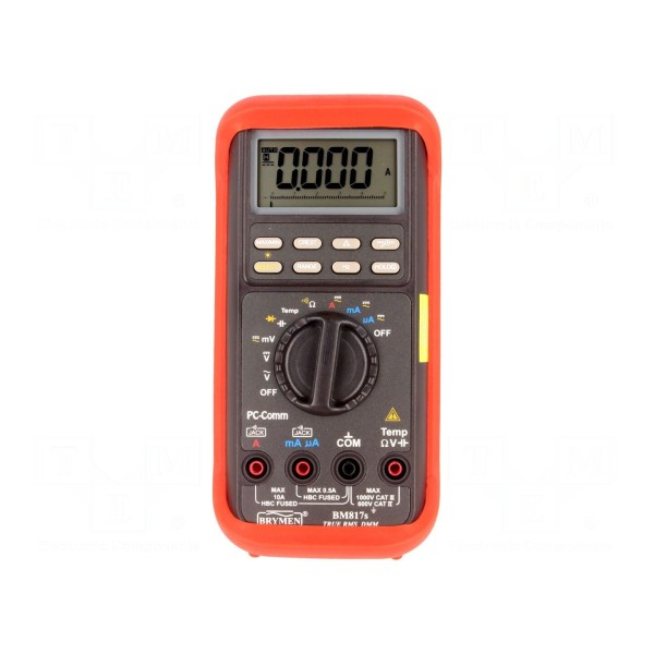 Multimetr cyfrowy BRYMEN BM817S to przyrząd umożliwiający precyzyjny pomiar napięcia DC i AC w zakresach od 50mV do 1kV, prądu DC i AC do 10A, a także rezystancji, pojemności i częstotliwości w zakresie 10–125kHz. Urządzenie mierzy temperaturę od -50°C do 1000°C oraz obsługuje test ciągłości obwodu z sygnalizacją akustyczną i test diody. Dzięki implementacji funkcji True RMS przyrząd zapewnia dokładne pomiary rzeczywistej wartości skutecznej. Wyświetlacz LCD z 52-segmentowym bargrafem odświeżanym z częstotliwością 60x/s oraz głównym próbkowaniem 5x/s ułatwia obserwację dynamicznych zmian sygnału.