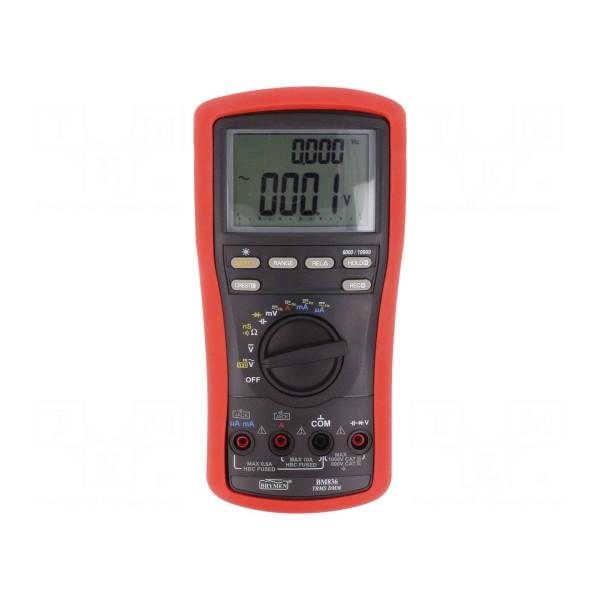 Multimetr cyfrowy BM836 służy do pomiaru napięcia AC/DC do 1kV, prądu AC/DC do 10A, rezystancji do 60MΩ, pojemności do 20mF oraz częstotliwości w zakresie do 440kHz. Urządzenie wyposażono w funkcję pomiaru rzeczywistej wartości skutecznej True RMS oraz wyświetlacz LCD o rozdzielczości 6000 z bargrafem 61-segmentowym odświeżanym z częstotliwością 40x/s. Próbkowanie pomiarów odbywa się z częstotliwością 5x/s.