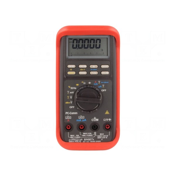 Multimetr cyfrowy BRYMEN BM857S-WB przeznaczony jest do pomiaru napięcia AC/DC, prądu AC/DC, rezystancji, pojemności, częstotliwości oraz współczynnika wypełnienia. Urządzenie wykorzystuje funkcję pomiaru rzeczywistej wartości skutecznej True RMS i umożliwia testowanie diod oraz ciągłości obwodu z sygnalizacją akustyczną. Przyrząd oferuje zakresy pomiarowe napięcia do 1kV oraz prądu do 10A (z chwilowym zakresem 20A przez 30s). Wyposażony jest w wyświetlacz LCD o rozdzielczości 50000 z bargrafem 42 segmenty, który odświeża pomiary z częstotliwością 5x/s.