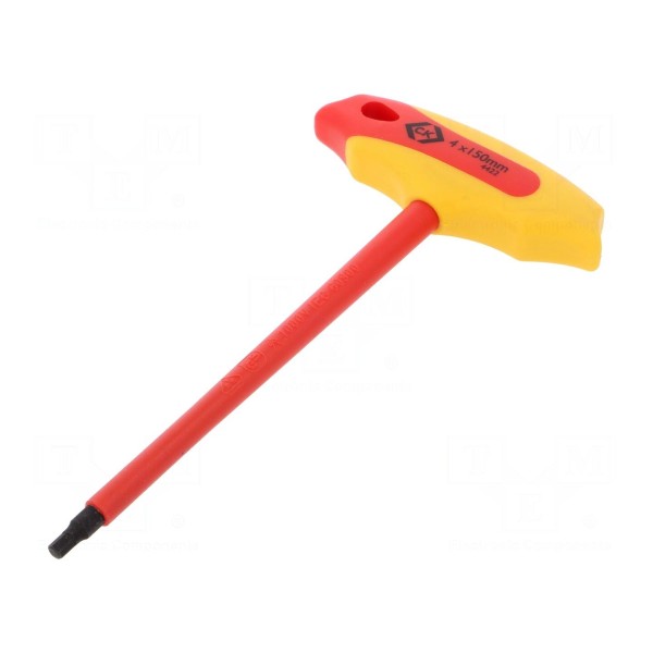 Klucz imbusowy C.K T4422-04 wyposażony jest w końcówkę HEX o rozmiarze 4 mm oraz charakteryzuje się długością całkowitą wynoszącą 150 mm. Narzędzie zostało wykonane ze stali chromowo-wanadowej, co zapewnia parametry fizyczne właściwe dla tego rodzaju materiału.