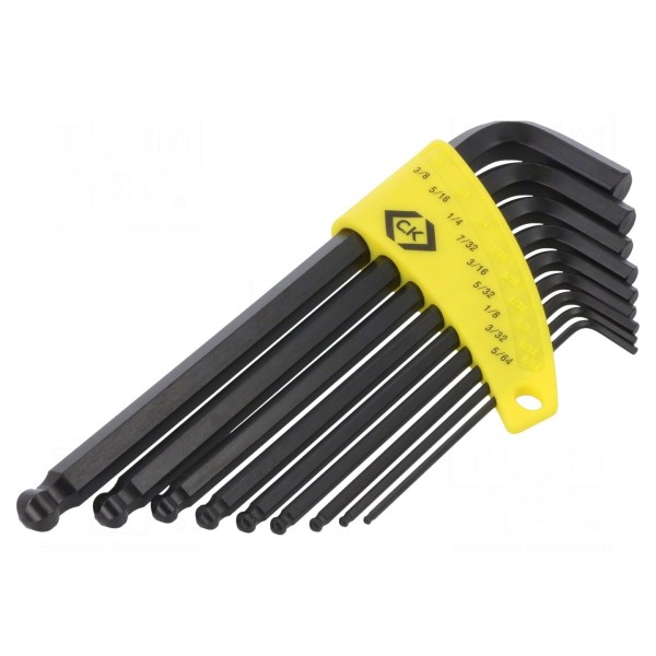 Zestaw zawiera 9 kluczy imbusowych o przekroju sześciokątnym w rozmiarach calowych. Narzędzia posiadają końcówki kuliste, które umożliwiają pracę pod kątem w miejscach o ograniczonym dostępie. W skład kompletu wchodzą rozmiary: HEX 1/4", HEX 1/8", HEX 3/8", HEX 3/16", HEX 3/32", HEX 5/16", HEX 5/32", HEX 5/64" oraz HEX 7/32".