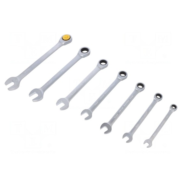 Zestaw zawiera siedem kluczy płasko-oczkowych wyposażonych w mechanizm grzechotkowy. W komplecie znajdują się narzędzia o rozmiarach 8mm, 10mm, 12mm, 13mm, 15mm, 17mm oraz 19mm.