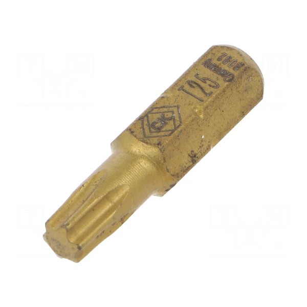 Powierzchnia narzędzia została wzmocniona poprzez pokrycie azotkiem tytanu. Długość całkowita końcówki wynosi 25mm.