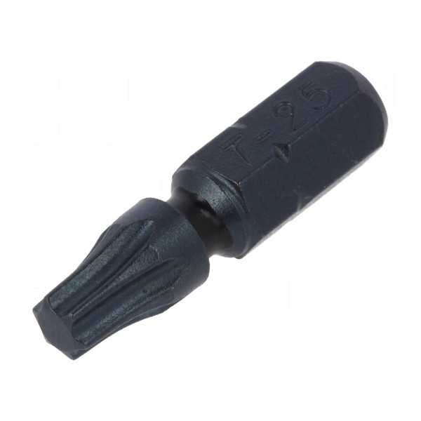 Końcówka wkrętakowa o profilu Torx w rozmiarze TX25 została wykonana ze stali. Element jest przystosowany do pracy z uchwytami o rozmiarze 1/4" (C6,3mm).