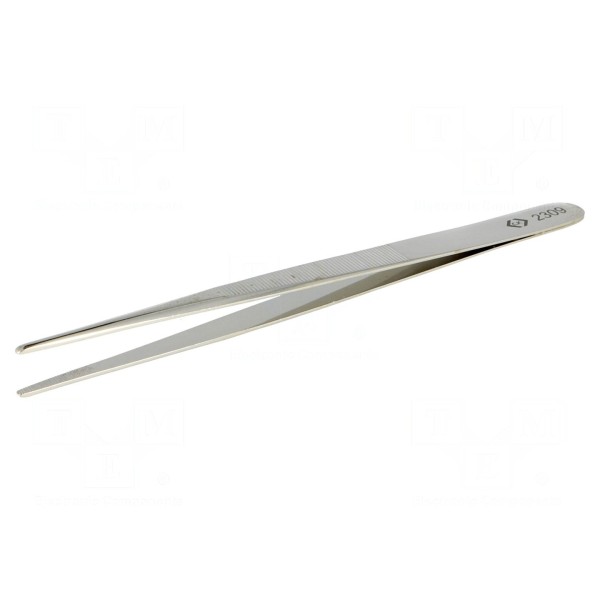 Pęseta prosta o długości 140 mm wykonana została ze stali węglowej. Narzędzie posiada wydłużony kształt ostrzy oraz zaokrąglone końcówki o szerokości 2 mm.