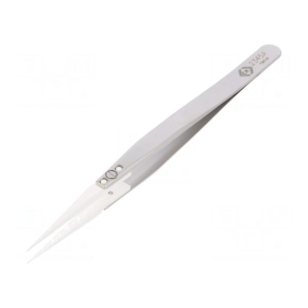 Pęseta prosta o długości 140 mm została wykonana z aluminium, natomiast jej końcówki wykonano z ceramiki. Narzędzie posiada właściwości antyelektrostatyczne (ESD), jest niemagnetyczne oraz wykazuje niską przewodność cieplną. Ostre zakończenie zapewnia precyzję podczas wykonywania drobnych prac montażowych i serwisowych.