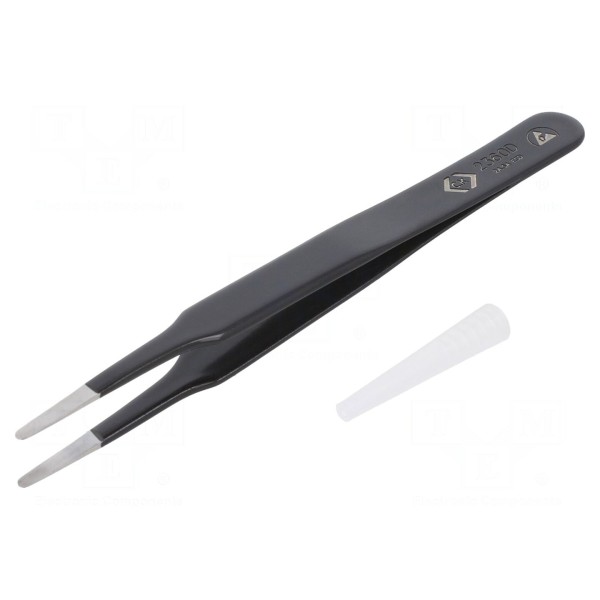 Pęseta typu ESD przeznaczona jest do precyzyjnego pozycjonowania elementów w środowiskach wymagających ochrony przed wyładowaniami elektrostatycznymi. Narzędzie wykonano w wersji ESD, co pozwala na bezpieczną pracę z podzespołami elektronicznymi wrażliwymi na ładunki statyczne.