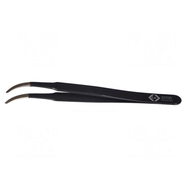Pęseta C.K T2370D to narzędzie o długości 117 mm, zaprojektowane w wersji ESD, co pozwala na bezpieczną pracę z elementami wrażliwymi na wyładowania elektrostatyczne. Model ten posiada prosty korpus oraz zagięte ostrza, które są zakończone w sposób zaokrąglony.