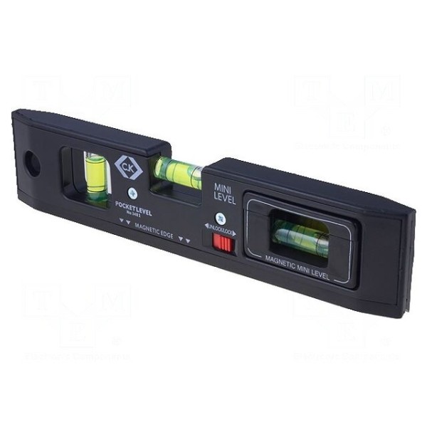 Urządzenie wyposażono w libellę pionową oraz dwie libelle poziome. Właściwości narzędzia obejmują magnetyczną podstawę oraz wyjmowalną libelę poziomą, która również posiada podstawę magnetyczną. Rozwiązanie to umożliwia precyzyjne poziomowanie niewielkich elementów, w tym gniazdek elektrycznych.